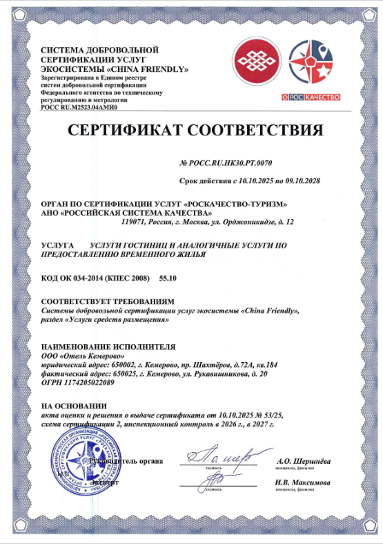 Рады сообщить вам о том, что мы первый отель в Кузбассе, прошедший добровольную сертификацию услуг экосистемы "CHINA FRIENDLY"! У нас созданы все необходимые и комфортные условия для граждан КНР.