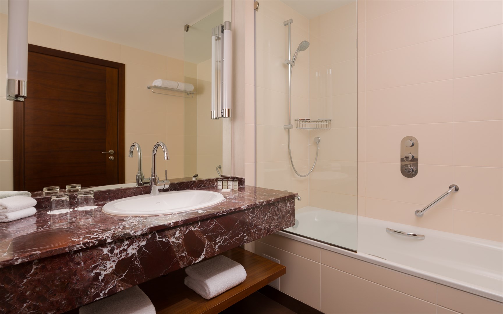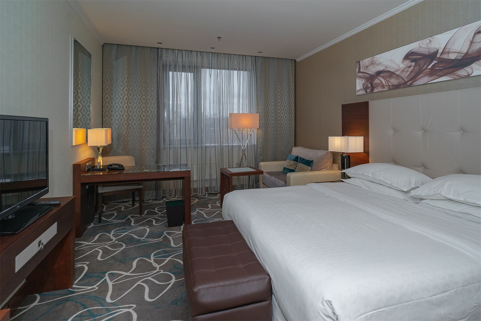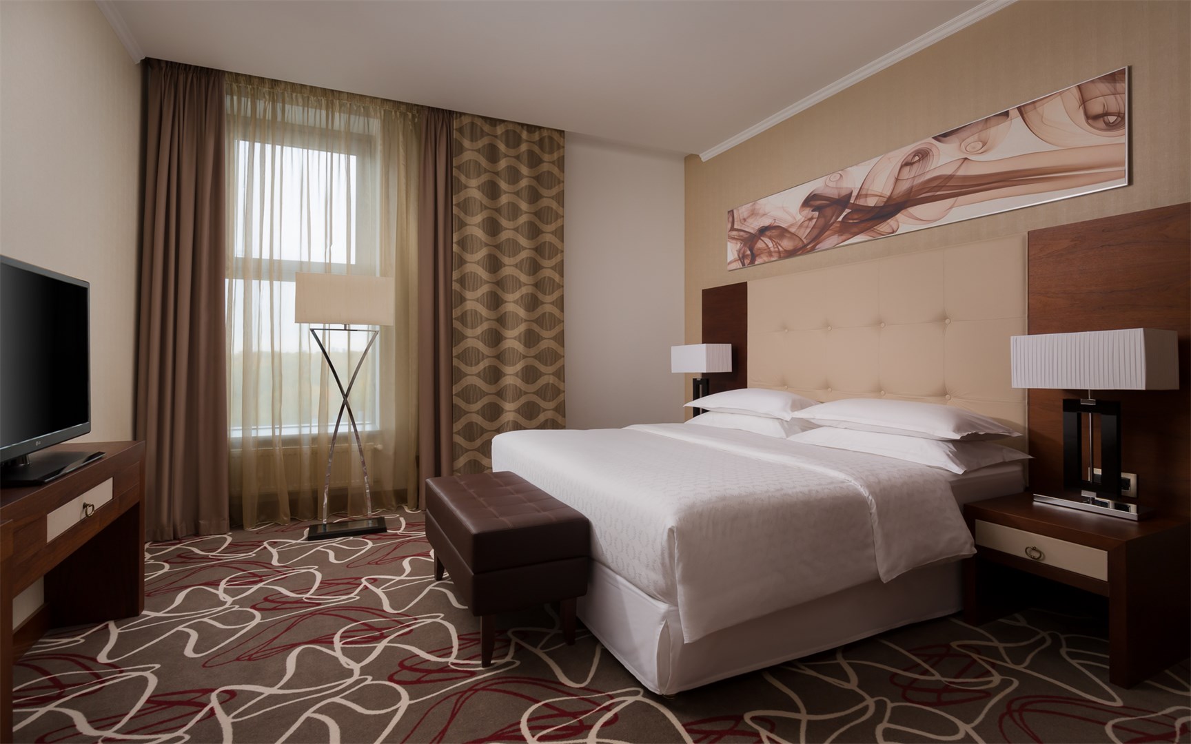 Расчитанный на деловых людей и туристов, Скайпоинт Люкс предлагает яркую и в то же время уютную атмосферу. Гости могут воспользоваться беспроводным бесплатным доступом в Интернет и всегда оставаться на связи с родными и близкими благодаря Link@SheratonSMсовместно с Microsoft®, высоко-технологичным центром в самом сердце лобби. Общий номерной фонд гостиницы составляет 334 номера, включая люксы. Фирменная кровать Sheraton Sweet Sleeper Bed™, гарантирует гостям крепкий сон. Классический дизайн в современной интерпретации- отличительная черта бренда Sheraton™. Интерьеры номеров оформлены в теплых тонах из современных материалов, мебель отделана натуральным шпоном американского ореха, в ванной комнате представлен итальянский мрамор и Villeroy & Boch керамогранитные светильники. Идеальное место для Вашего любого мероприятия, Скайпоинт Люкс предоставляет гостям конференц-залы, общей площадью до 1000 квадратных метров, оснащенных доступом в Интернет и современным аудио и видео оборудованием. Бальный зал TheGrandBallroom площадью 535 квадратных метров, вмещающий до 600 человек, украшает высокий потолок с хрустальными люстрами от мастеров Гусь Хрустального. Зал подходит для любого мероприятия от небольшой деловой встречи до международных форумов.Зал делится перегородками на три зоны.
